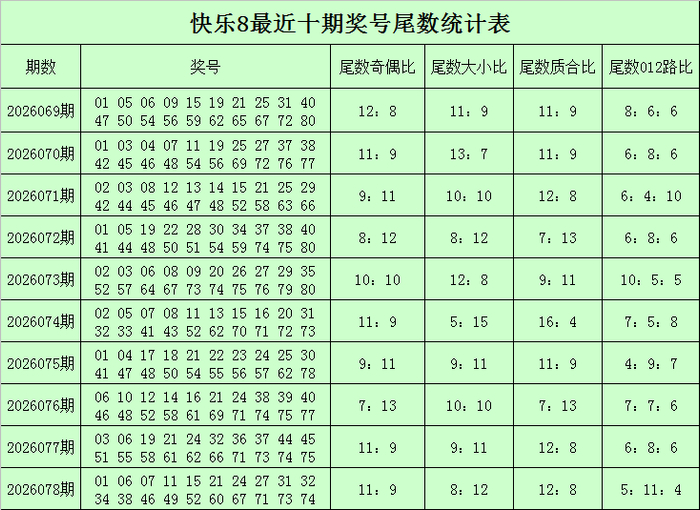 福彩欢快8第2026078期开奖讲究:01 06 07 11 15 21 24 27 31 32 34 38 46 49 52 60 67 71 73 74,其中奖号余数奇偶比为11:9,余数012路比为5:11:4,余数大小比为8:12,余数质合比为12:8。