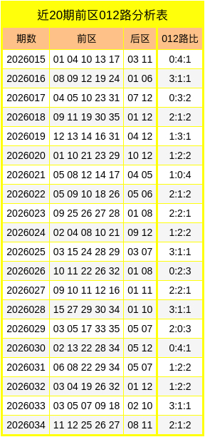 详尽分析,第26035期大乐透前区012路比参考0:1:4。