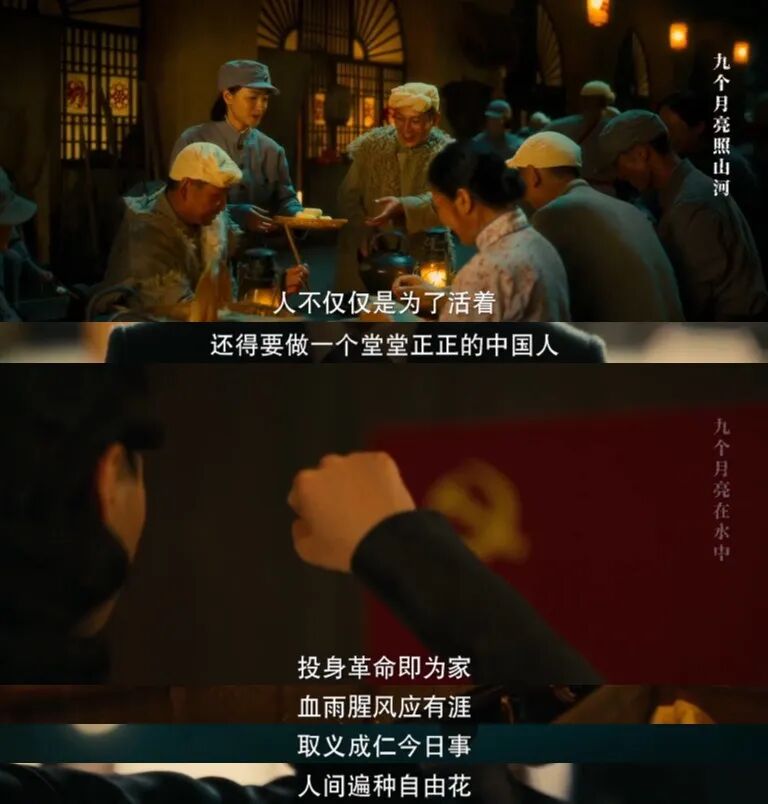 片尾曲《九个月亮》则是导演在创作会上的随心灵感,“九个月亮在天上/九个月亮在水中”“日间放歌须纵酒/芳华作伴好还乡”……歌词取杜甫《闻官军收河南河北》的名句,诗圣在忽闻战乱平息后的狂喜之情,虽隔千百年,“能让咱们多个维度知道战役,知道中华英才的心怀与形貌”。